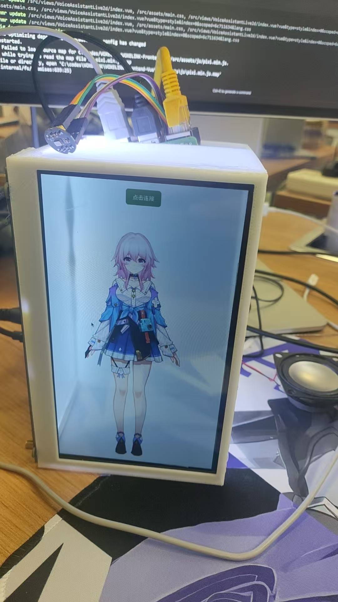 具体实现是将 live2d 放映在一块扣掉背板的 7 寸树莓派显示器上,实现伪 3d 的效果,然后串联并优化 STT->LLM->TTS 流程实现较低延迟。(最快的时候 2s 就能够音频响应)